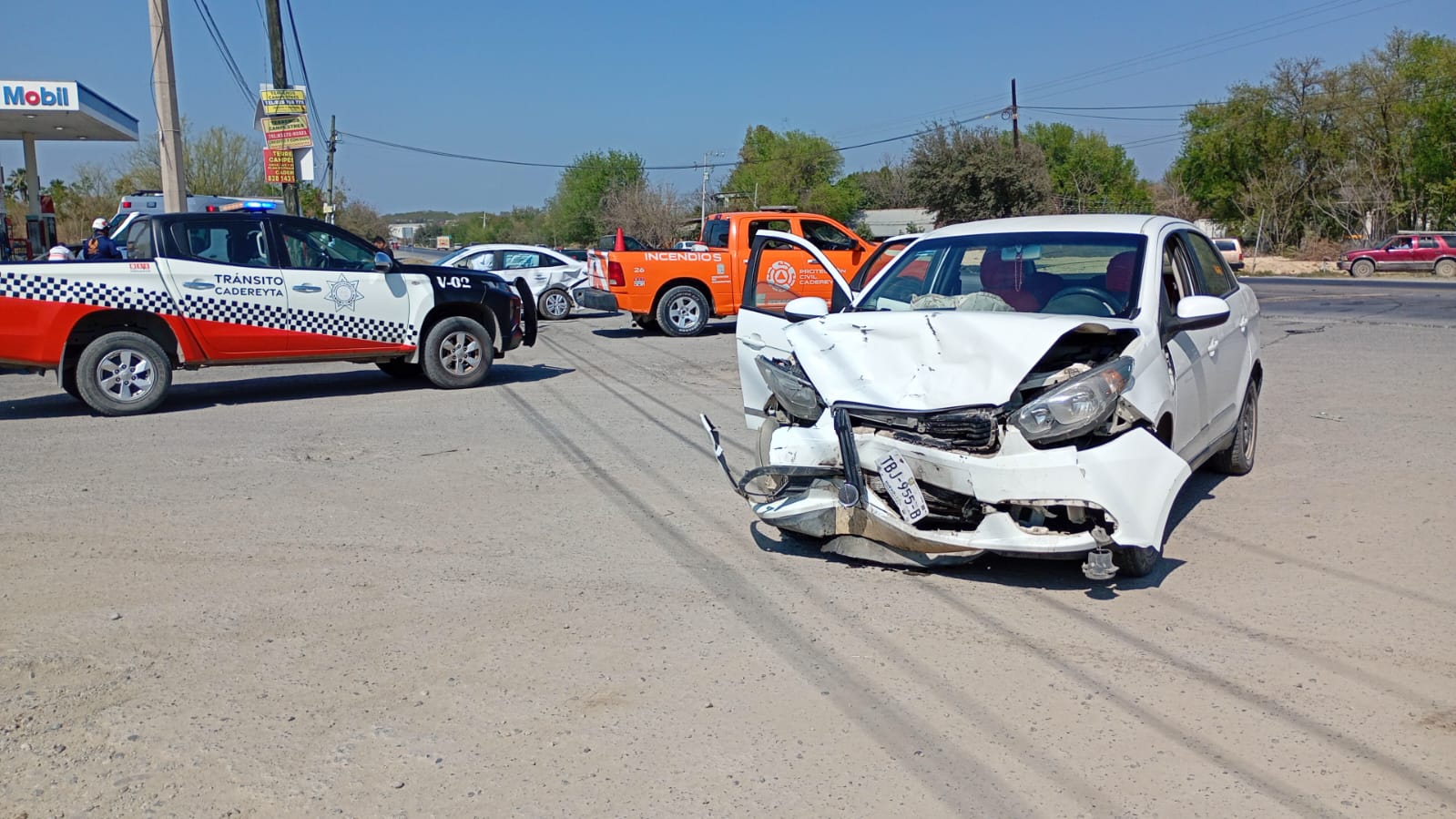 Cadereyta N.L.- Un choque entre un Chevrolet AVEO 2025 de color blanco con placas de Coahuila y un Dodge Vision 2017 también blanco se registró la tarde de este viernes sobre la carretera Cadereyta-Allende, a la altura de la entrada a las albercas de San Bartolo, en el municipio de Cadereyta.