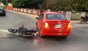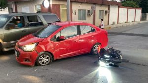 Cadereyta N.L.- Un accidente se registró en el centro de Cadereyta, en el cruce de la calle Hidalgo con Joaquín Valle, entre una motocicleta y un vehículo de color rojo. El incidente dejó un lesionado de sexo masculino, quien se encuentra esperando atención médica en el lugar.