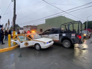 Cadereyta N.L.- Hace unos momentos, un accidente se suscitó en el centro de Cadereyta, donde un taxi que se pasó un alto fue impactado por una unidad de policía del municipio de Cadereyta. Al lugar llegaron elementos de Tránsito y Protección Civil de Cadereyta para atender a una persona de sexo femenino lesionada que iba a bordo del taxi.