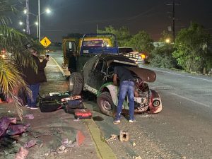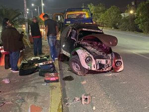 Cadereyta N.L.- Un accidente se suscitó hace unos momentos sobre la calle Vicente Guerrero, a la altura de la Cruz Verde, en Cadereyta. Según informes preliminares, un vehículo Volkswagen, conocido como “vocho”, perdió el control y se subió al camellón, impactando contra una de las columnas que se encuentran en el lugar.