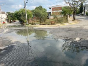 Juárez, N.L.- Residentes de las calles Loma de San Mateo, Santa Clara y Palmillas denunciaron el estado en que se encuentra ese cruce, ya que hay una fuga de aguas negras que forma lagunas insalubres y malolientes, además de la basura y los baches.