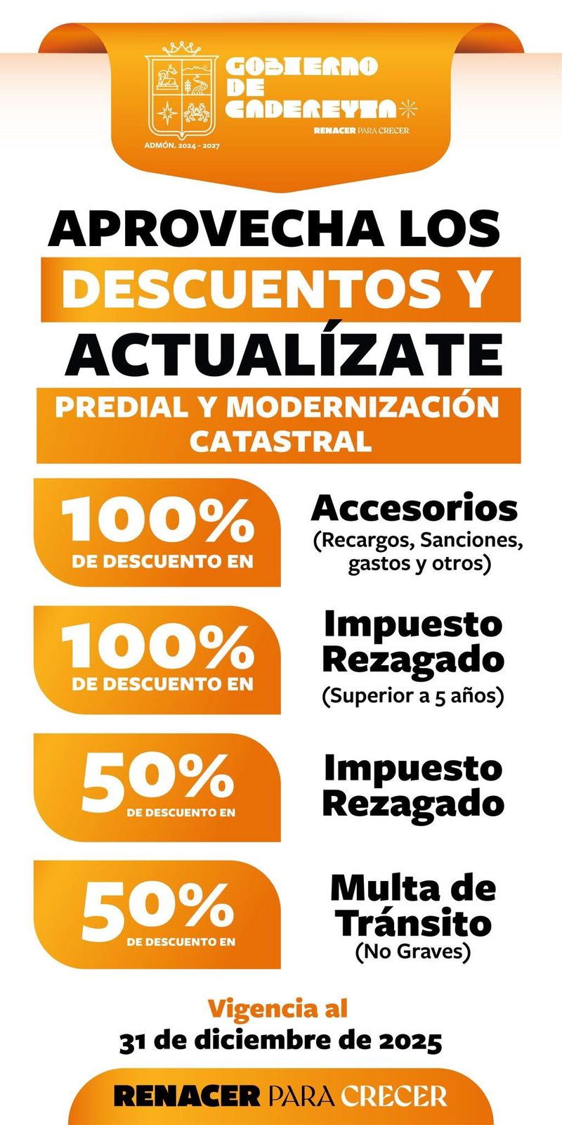 Cadereyta N.L.- El alcalde Carlos Rodríguez “El Cuate” invita a todos los ciudadanos a aprovechar los descuentos y beneficios del programa de regularización del predial. No pierdas la oportunidad de ponerte al día y sumarte al programa de modernización catastral.