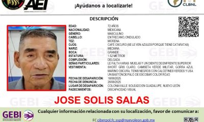 Juárez, N.L.- Al ser visto por última vez en cerca de la carnicería María Cristina, en Juárez, Nuevo León, José Solís Salas es buscado afanosamente en...