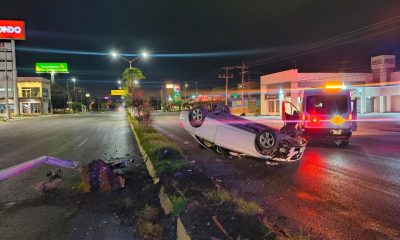 Cadereyta N.L.- La madrugada de hoy, un vehículo tipo sedán volcó en la calle 20 de Noviembre, frente a Autozone, en Cadereyta. El conductor, un...