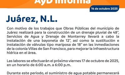 Juárez, N.L.- Agua y Drenaje de Monterrey, emitió un boletín donde anunciaba el corte del suministro de agua a 26 colonias de Juárez, desde la mañana...
