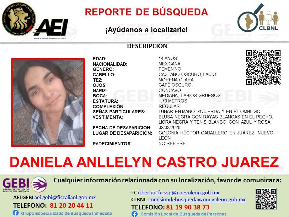 Reportes de búsqueda Ayúdanos a localizar a Daniela Anllelyn Castro Juarez Publicada hace 1 hora el 4 marzo, 2026 Por Staff2 Facebook Twitter Email Temas relacionados: Te podría gustar