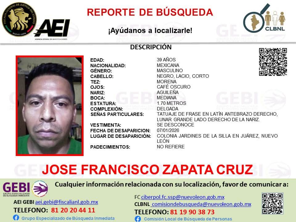 Reportes de búsqueda Ayúdanos a localizar a José Francisco Zapata Cruz Publicada hace 3 días el 15 enero, 2026 Por Staff2 Facebook Twitter Email Temas relacionados: Te podría gustar