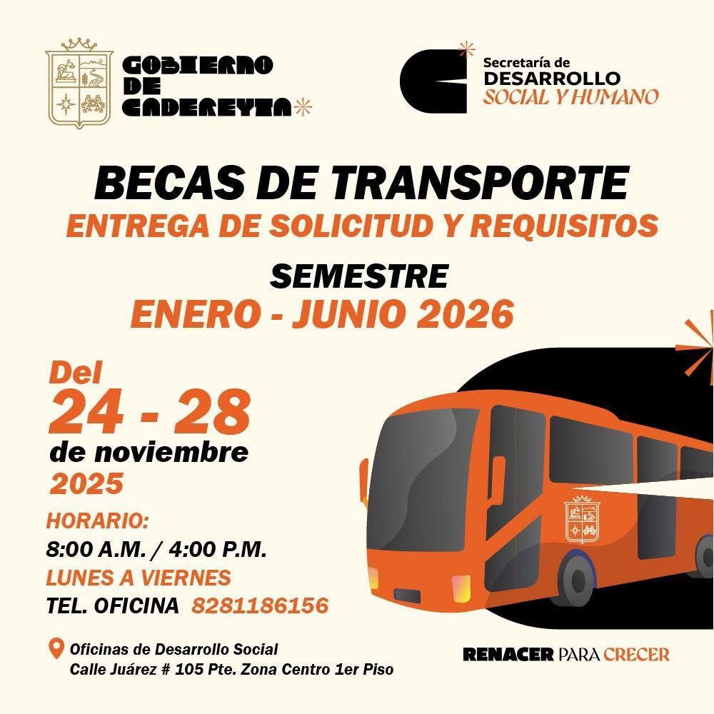 Cadereyta N.L.- ¡Atención estudiantes de Cadereyta! ¿Necesitas apoyo para tus traslados escolares? El Gobierno de Cadereyta, a través de la Secretaría de Desarrollo Social y Humano, te invita a participar en el programa de Becas de Transporte para el semestre enero – junio 2026. Entrega de solicitud y requisitos: del 24 al 28 de noviembre 2025, 8:00 a.m. a 4:00 p.m. (lunes a viernes) en Oficinas de Desarrollo Social: Calle Juárez #105 Pte., Zona Centro, 1er Piso. Informes al 828 118 6156.