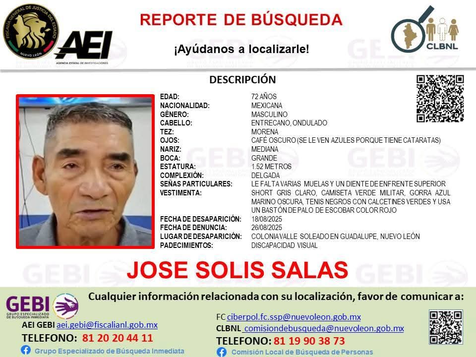 Juárez, N.L.- Un hombre de la tercera edad quien se extravió desde hace dos meses de la colonia Valle Soleado, en Guadalupe, es buscado en la colonia Anzures y Los Puertos en Juárez, donde se ha visto últimamente.
