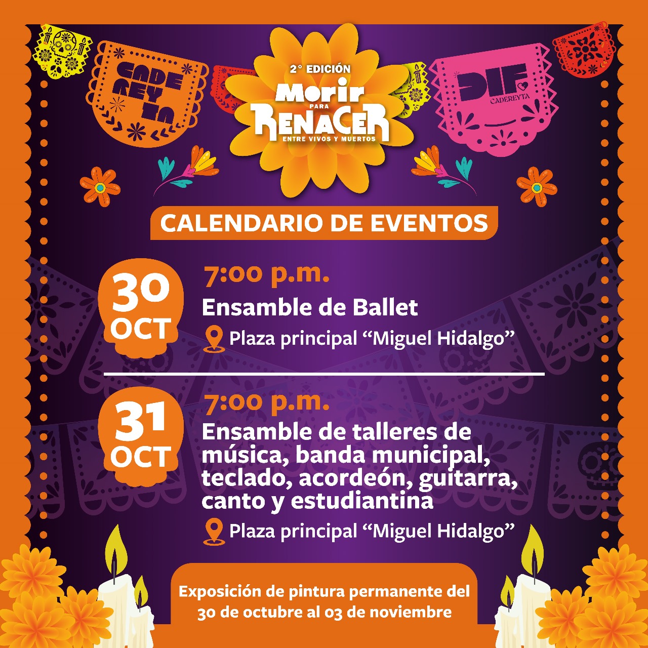 Cadereyta N.L.- El Municipio de Cadereyta te invita a la segunda edición del evento “Morir para Renacer” entre Vivos y Muertos, que se llevará a cabo en la Plaza Principal Miguel Hidalgo los días 30 y 31 de octubre a las 7:00 de la tarde.