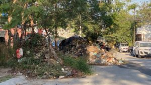 Juárez, N.L.- Decenas de reportes se han hecho al municipio, pero ninguno de ellos se han contestado, sobre la calle Circuito Vista de San Fernando, donde se encuentra un montón de basura que obstruye banqueta y carpeta asfáltica en la colonia Vistas del Río.