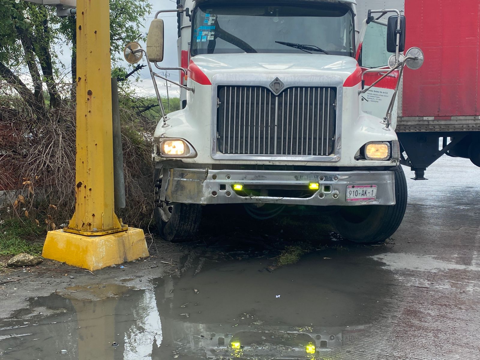 Cadereyta N.L.- Este jueves por la mañana, un camión se impactó contra un semáforo en el cruce del libramiento Alfonso Martínez Domínguez con carretera Cadereyta-Allende. Afortunadamente, el chofer no sufrió lesiones.