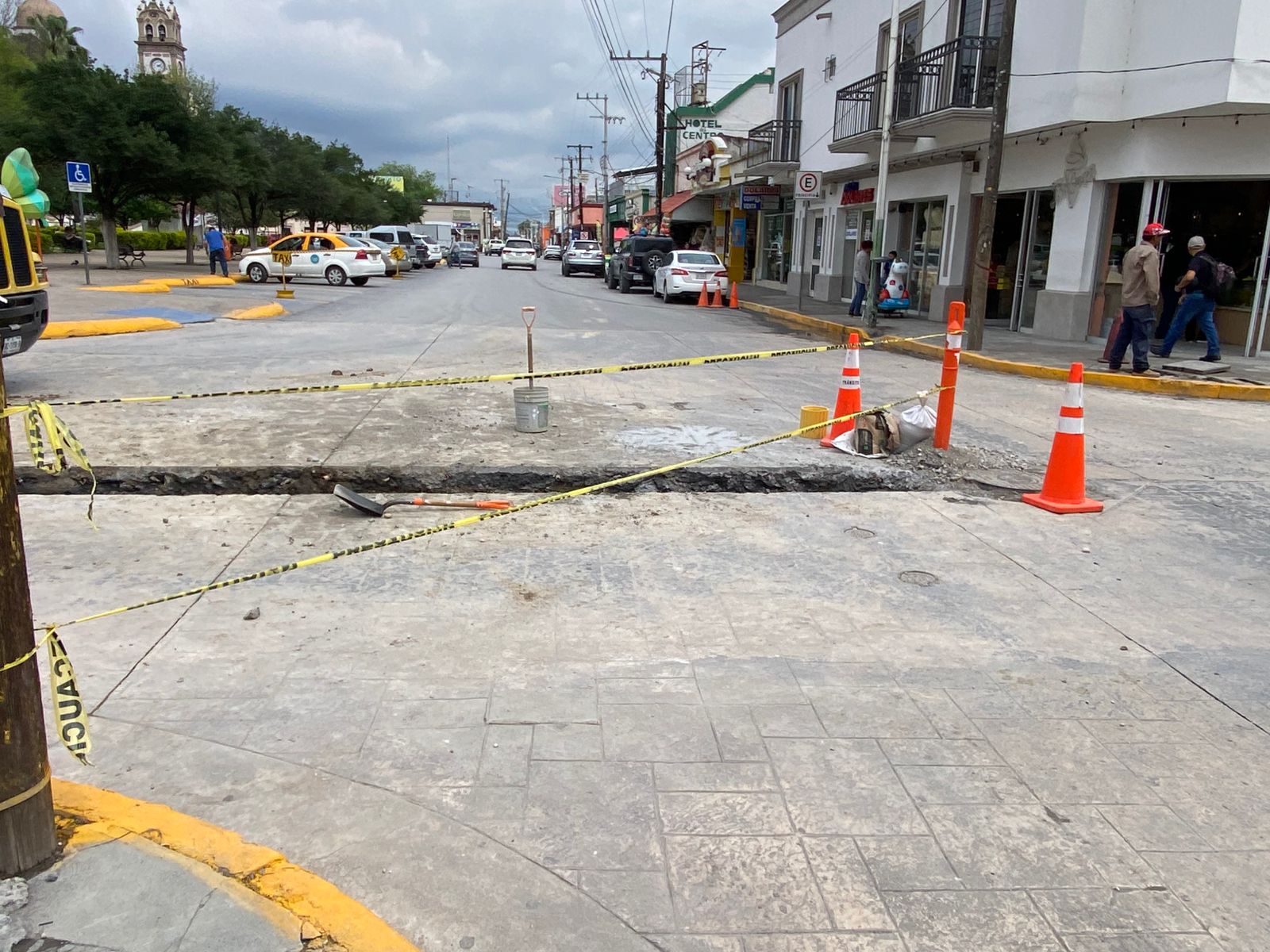 Cadereyta N.L. — La calle 20 de Noviembre, en la intersección con Juárez y Miguel Hidalgo frente a la Plaza Principal Miguel Hidalgo, fue cerrada en su totalidad debido a trabajos de introducción de tubería nueva.