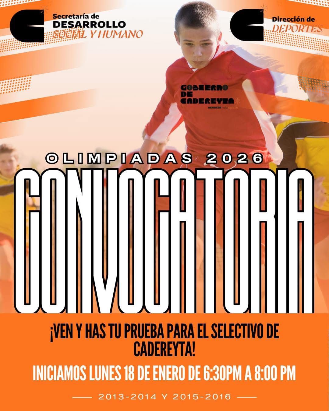 Cadereyta N.L.- Este lunes 19 de enero, a las 6:30 p.m., la Selección Cadereyta invita a todos los niños de las categorías 2013-2014 y 2015-2016 a un entrenamiento de prueba en la Unidad Deportiva Cadereyta.
