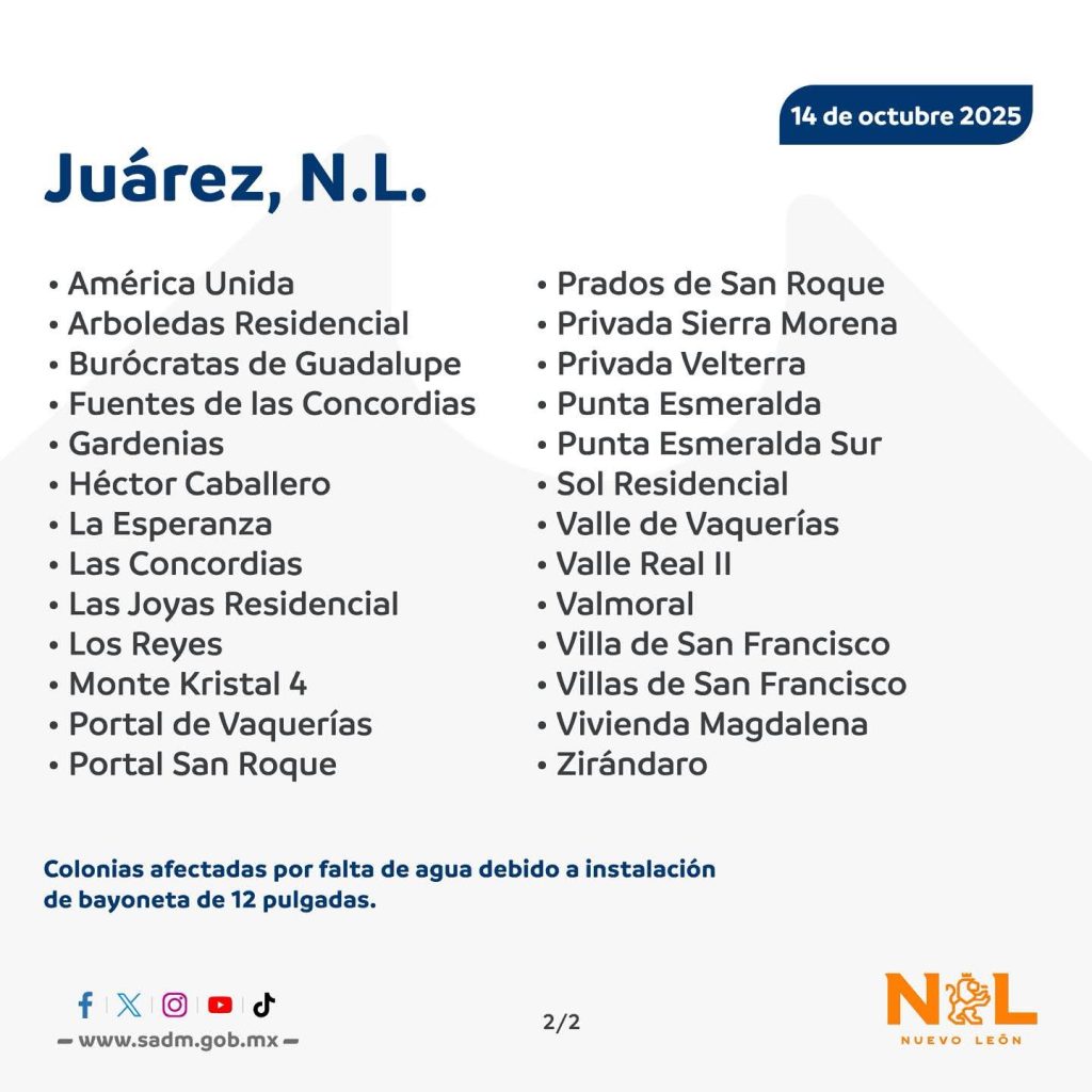 También estarán sin el vital líquido, Las Concordias, Hector Caballero, La Esparanza, Las Joyas Residencial, Los Reyes, Portal de Vaquerías, Portal de San Roque, Monte Kristal Cuarto Sector, Privada Sierra Morena, Prados de San Roque y Privada Velterra.