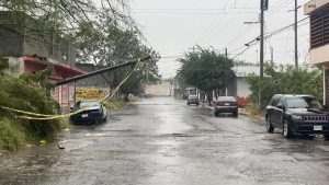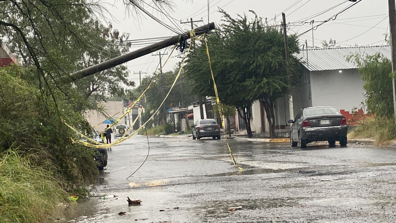 Juárez, N.L.- Un poste roto, suspendido por los cables y a punto de caer, se encuentra después de una semana en el fraccionamiento San Antonio.