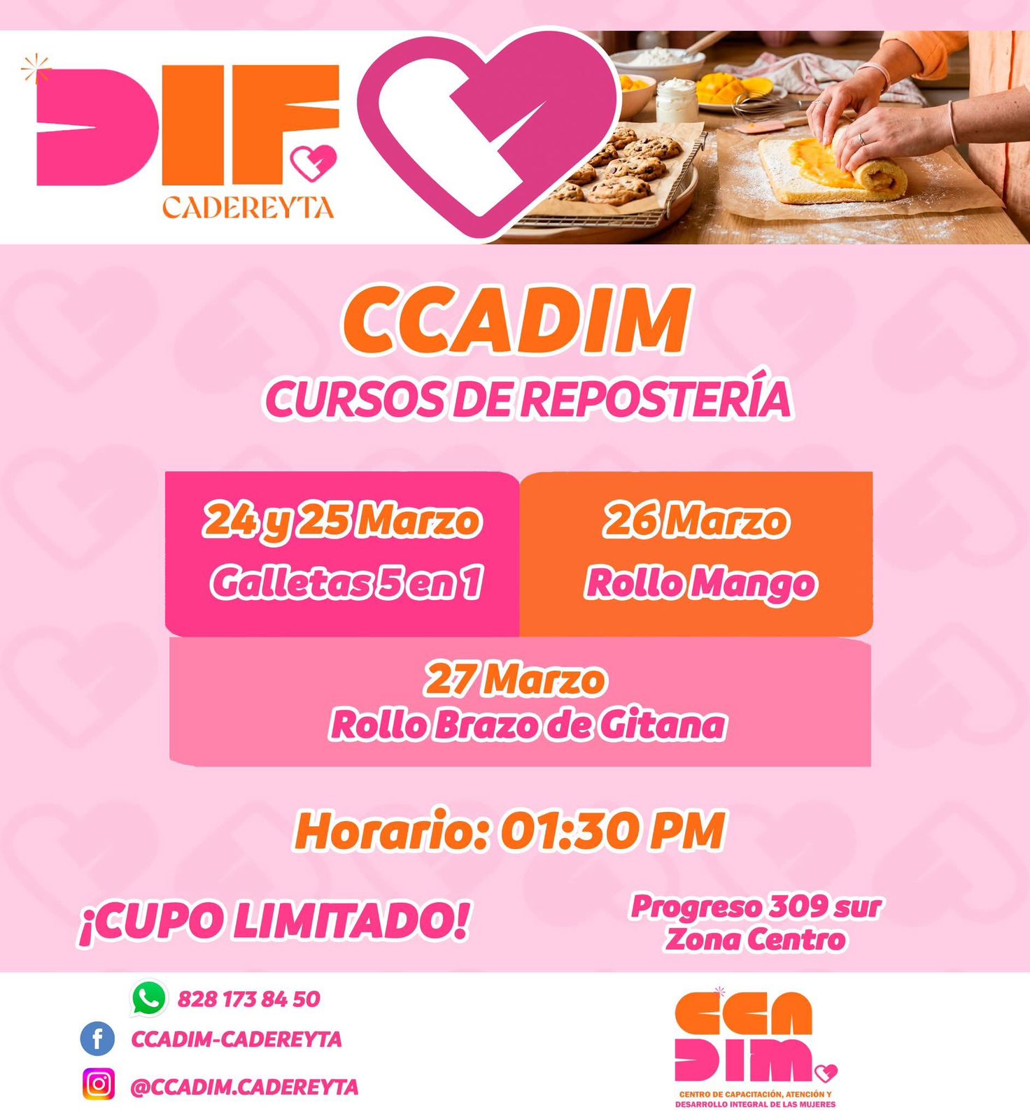 Cadereyta N.L.- El Sistema DIF Cadereyta invita a la comunidad a participar en sus cursos de repostería, donde podrás aprender a elaborar deliciosas recetas y fortalecer tus habilidades en cocina. Los cursos se realizarán en el CCADIM-Cadereyta, ubicado en Progreso 309 Sur, Zona Centro, los días 24 y 25 de marzo con el curso “Galletas 5 en 1”, el 26 de marzo con “Rollo de mango” y el 27 de marzo con “Rollo brazo de gitana”, todos a las 1:30 PM. El cupo es limitado, por lo que se recomienda inscribirse con anticipación. Para más información e inscripciones, puedes llamar al 828 173 84 50 o visitar la página del CCADIM-Cadereyta. No te pierdas esta oportunidad de aprender y disfrutar de la repostería.