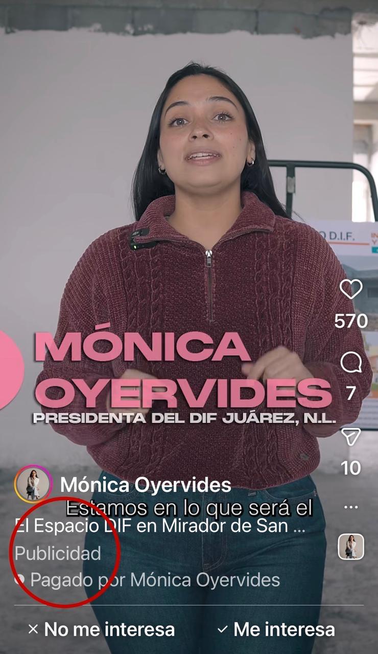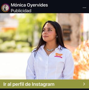 Mónica Oyervides, presidenta del DIF de Juárez, es mencionada como probable aspirante a suceder en las próximas elecciones a su esposo, por lo que tanta publicidad pagada sería un acto anticipado de campaña, pagado por el edil juarense, al no tener si esposa un salario en la administración.