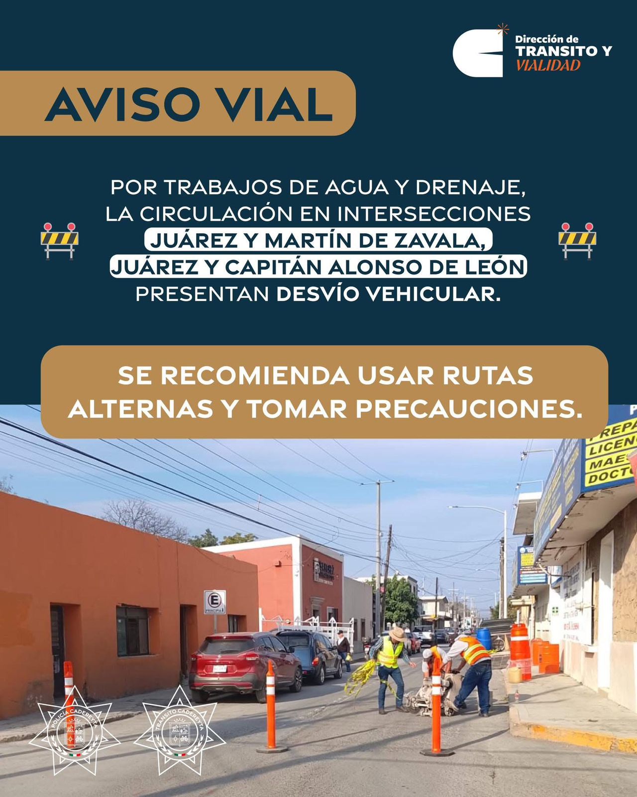 Cadereyta N.L.- Debido a trabajos de mantenimiento de Agua y Drenaje, se registra desvío de circulación en los cruces de Juárez y Martínez Zavala; y Juárez y Capitán Alonso de León.