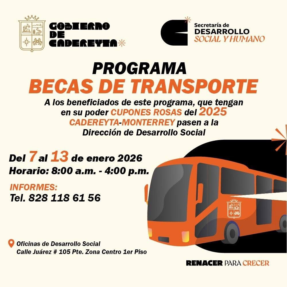 Cadereyta N.L.- El Gobierno de Cadereyta invita a los estudiantes que aún cuentan con cupones rosas del 2025 (Cadereyta – Monterrey) a acudir a la Dirección de Desarrollo Social para su entrega.
