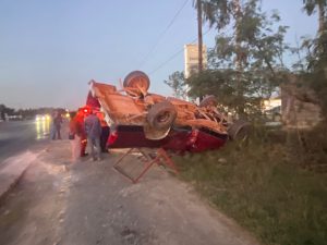 Según informes, la camioneta de color rojo intentaba ingresar a una gasera cuando la camioneta color blanco la impactó por un costado, lo que derivó en una volcadura por un costado de la carretera.