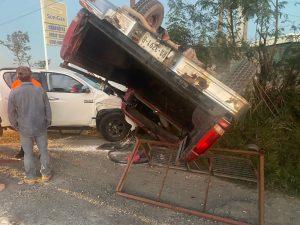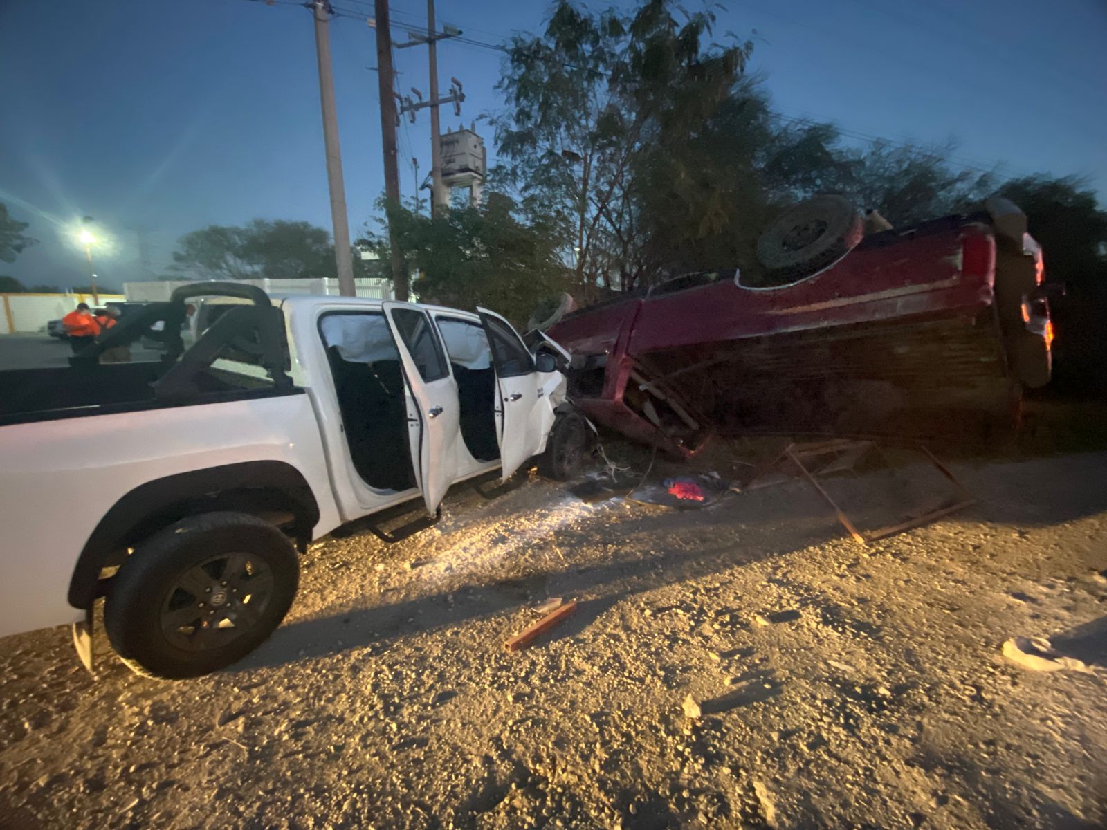 Según informes, la camioneta de color rojo intentaba ingresar a una gasera cuando la camioneta color blanco la impactó por un costado, lo que derivó en una volcadura por un costado de la carretera.