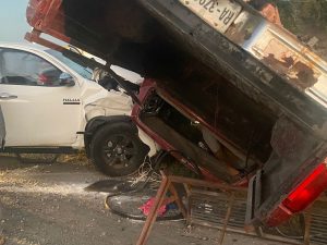 Cadereyta, N.L.- Este jueves por la tarde se suscitó un fuerte accidente sobre la carretera Cadereyta-Allende, a la altura del kilómetro seis, en donde participaron una camioneta Ilux y otra camioneta color rojo con caja.