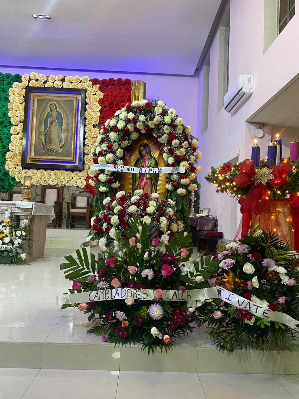 Cadereyta Jiménez, N.L.- Con arreglos florales, tanto el Sindicato de Trabajadores Petroleros de la República Mexicana, como la Gerencia de la Refinería “Héctor R. Lara Sosa”, de Cadereyta Jiménez, acudieron a la misa en honor a la Virgen de Guadalupe, en el Santuario de la colonia Lázaro Cárdenas.