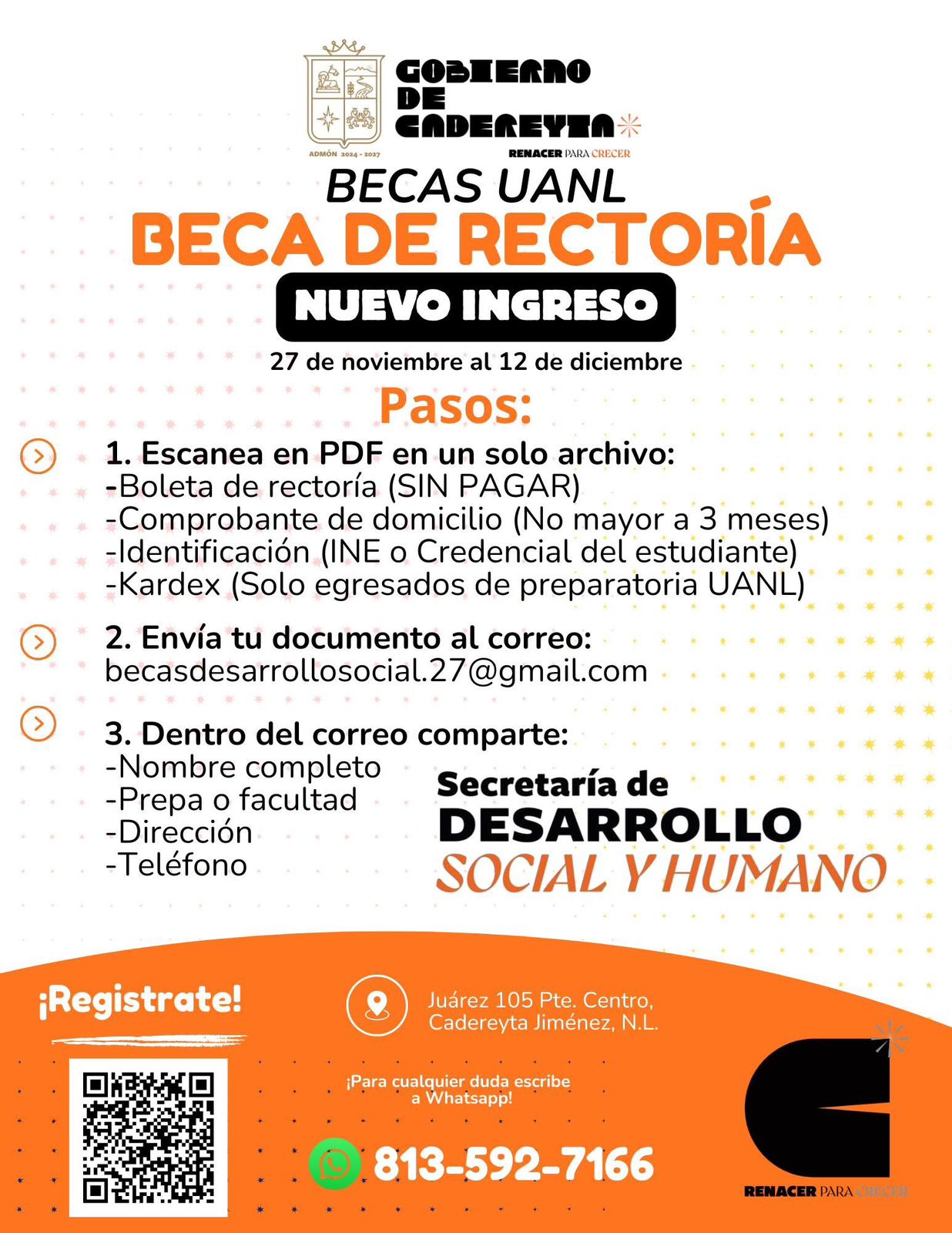 Cadereyta N.L.- El Gobierno de Cadereyta, a través de la Secretaría de Desarrollo Social y Humano, invita a todas y todos los jóvenes que ingresan por primera vez a la UANL a realizar su trámite de beca.