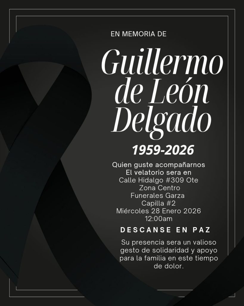 Cadereyta, N.L.-La comunidad es invitada a acompañar a la familia del señor Guillermo de León Delgado, en su velatorio, que se llevará a cabo este miércoles 28 de enero a las 12:00 horas en Funerales Garza, Capilla 2, ubicada en la calle Hidalgo 309.