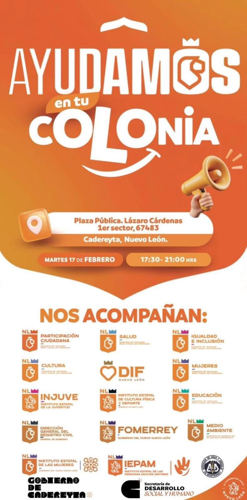 Cadereyta N.L.- El Gobierno Municipal de Cadereyta, encabezado por el alcalde Carlos Rodríguez “El Cuate”, en coordinación con dependencias del Gobierno del Estado de Nuevo León, realizará la jornada “Ayudamos en tu Colonia” este martes 17 de febrero en la Plaza Pública Lázaro Cárdenas 1° Sector.