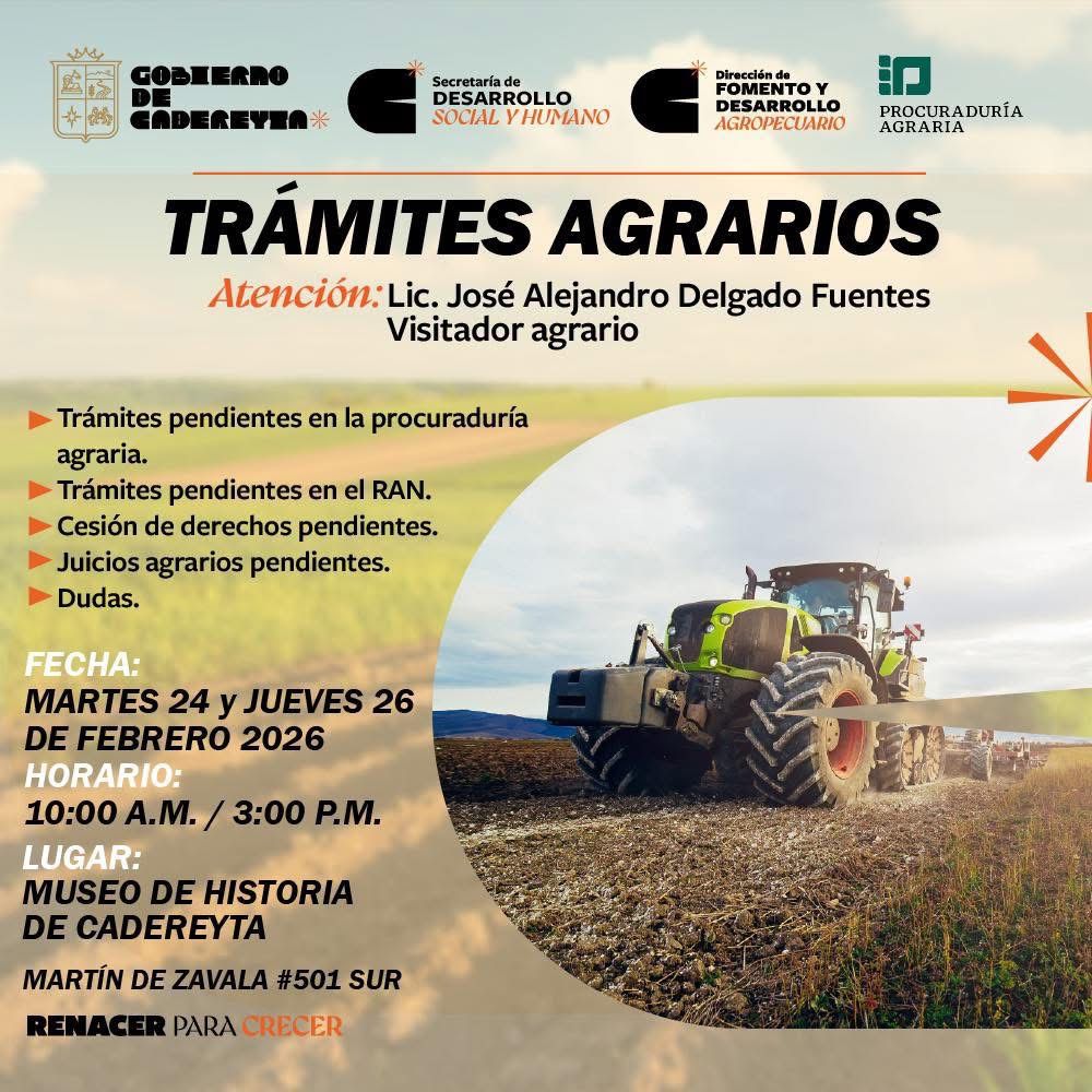 Cadereyta N.L.- El Gobierno de Cadereyta, a través de la Secretaría de Desarrollo Social y Humano, la Dirección de Fomento y Desarrollo Agropecuario y la Procuraduría Agraria, invita a productores y ejidatarios a participar en las jornadas de Trámites Agrarios con el Lic. José Alejandro Delgado Fuentes, Visitador Agrario.