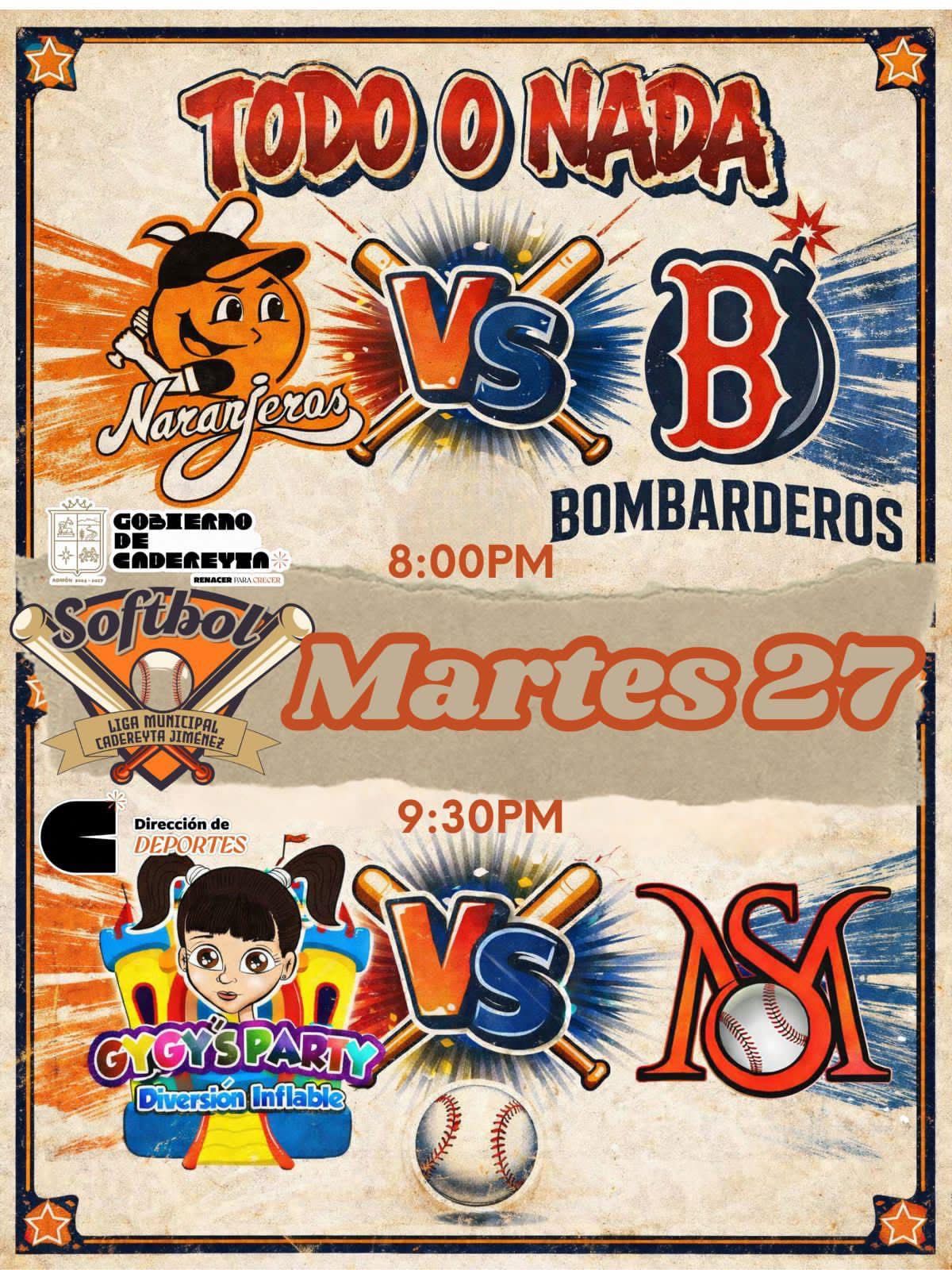 Cadereyta N.L.- Este martes 27 de enero se jugarán los encuentros suspendidos del pasado martes. 4 equipos, solo 2 boletos para los playoffs. Naranjeros y Bombarderos ya están calificados, pero Acuáticos, Los Morenos Sanguinarios, Cerveceros y Gygys Party luchan por un lugar. Naranjeros vs. Bombarderos, Martes 27 de Enero, 8:00 pm, Unidad Deportiva Alfonso Martínez Domínguez. Morenos Sanguinarios vs. Gygys Party, Martes 27 de Enero, 9:30 pm, Unidad Deportiva Alfonso Martínez Domínguez. ¡No te lo puedes perder!