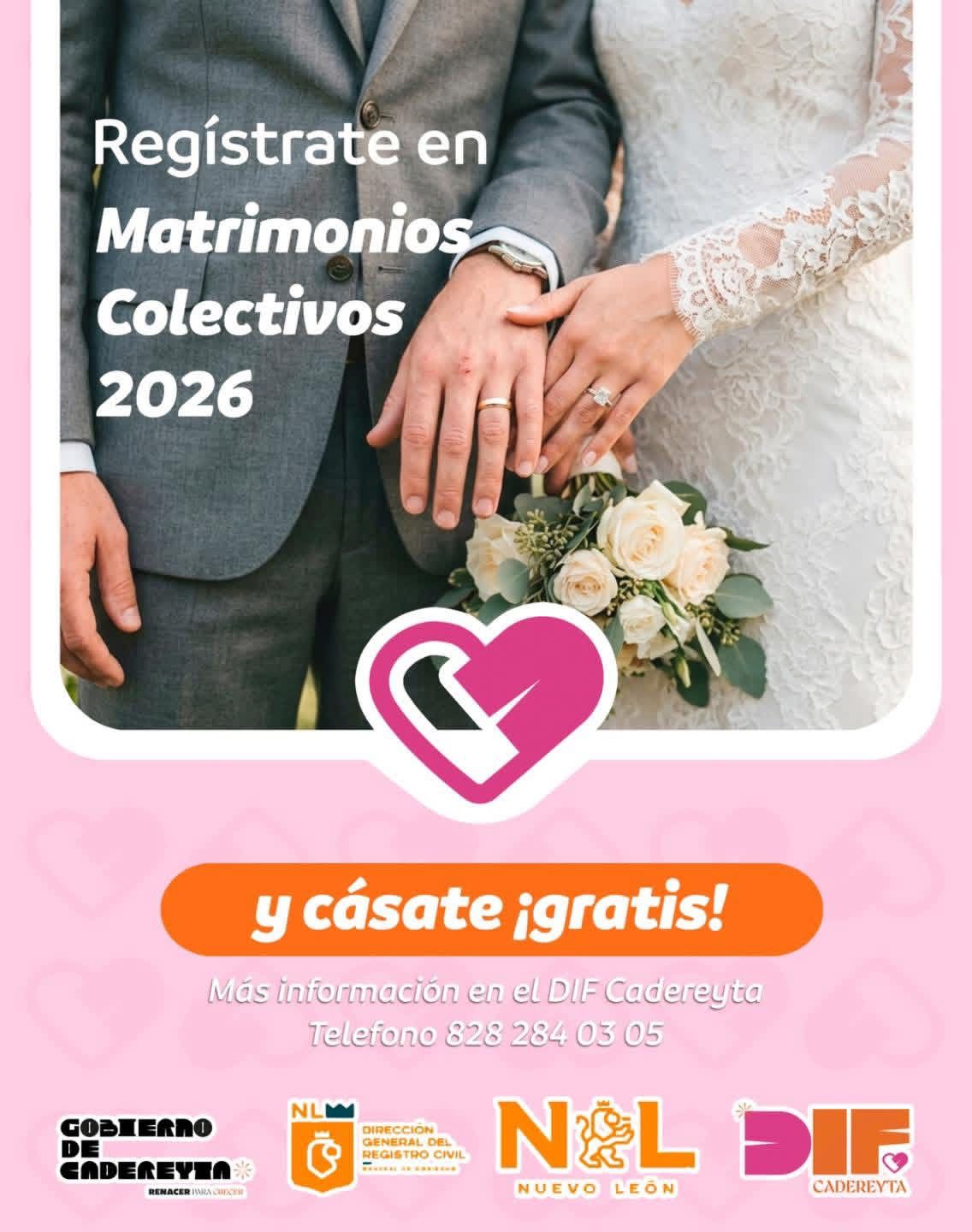 Cadereyta N.L.- El Sistema DIF Cadereyta invita a las parejas interesadas a unirse en los Matrimonios Colectivos, que se llevarán a cabo el 23 de abril de 2026. Requisitos: dos teléfonos y dirección, comprobante de exámenes prenupciales, INE, acta de nacimiento, acta de divorcio (si aplica), acta de defunción (si aplica). Entrega de requisitos a partir del lunes en las instalaciones del DIF municipal, ubicado sobre la calle Escobedo en el centro del municipio de Cadereyta. Para más información, llama al 828 284 03 05. No te pierdas esta oportunidad de hacer oficial tu amor.