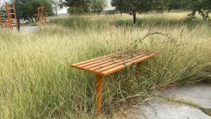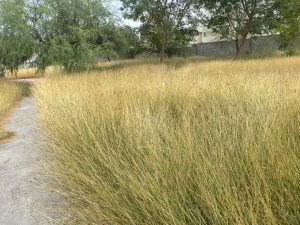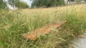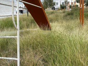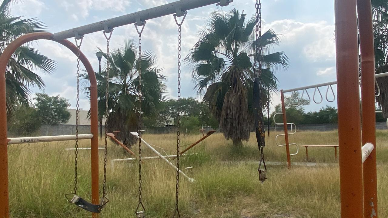 Los andadores rodeados de maleza, mientras los juegos descompuestos y semi-sepultados por el pasto.