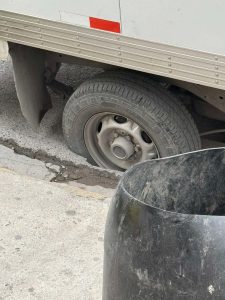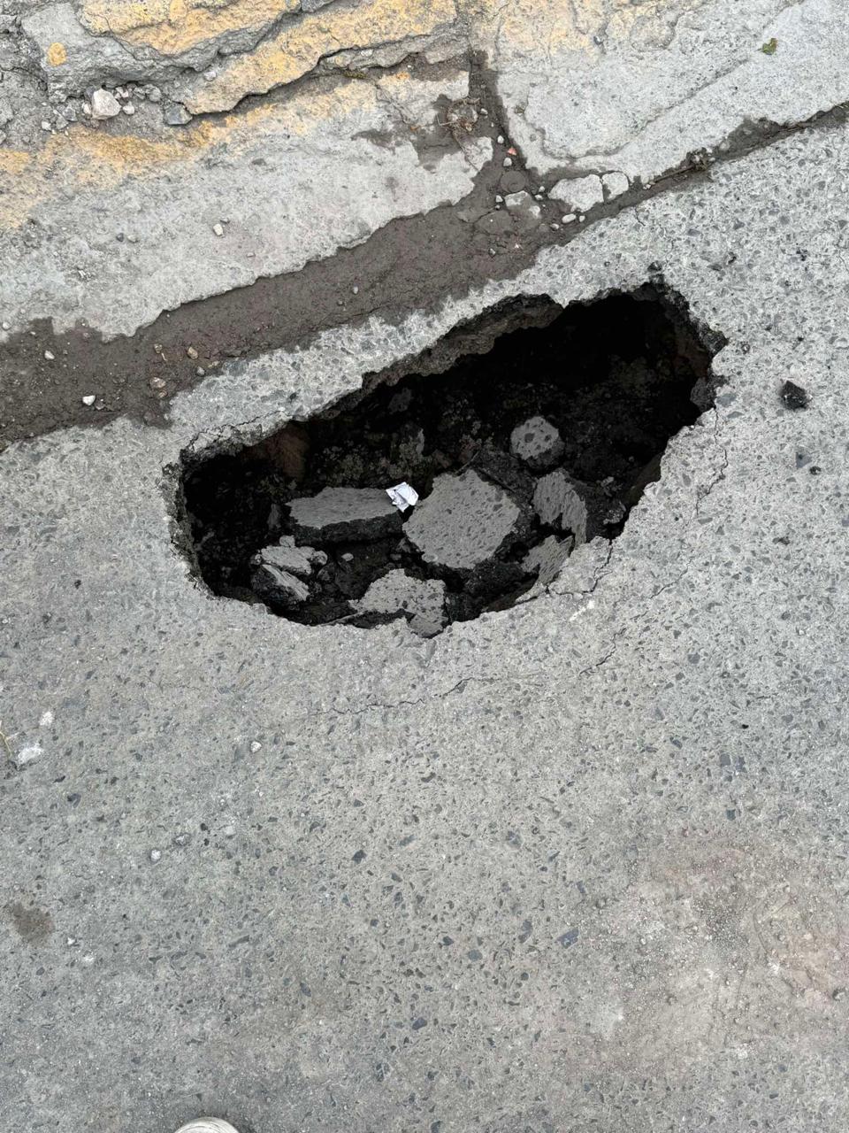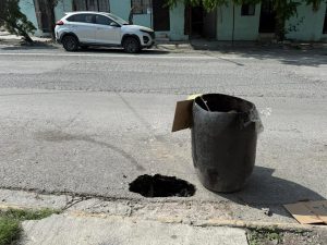 El profundo socavón tiene corriente de agua subterránea y ya han caído varios automovilistas, ya que no hay señalamientos, más que un bote que pusieron los mismos vecinos.