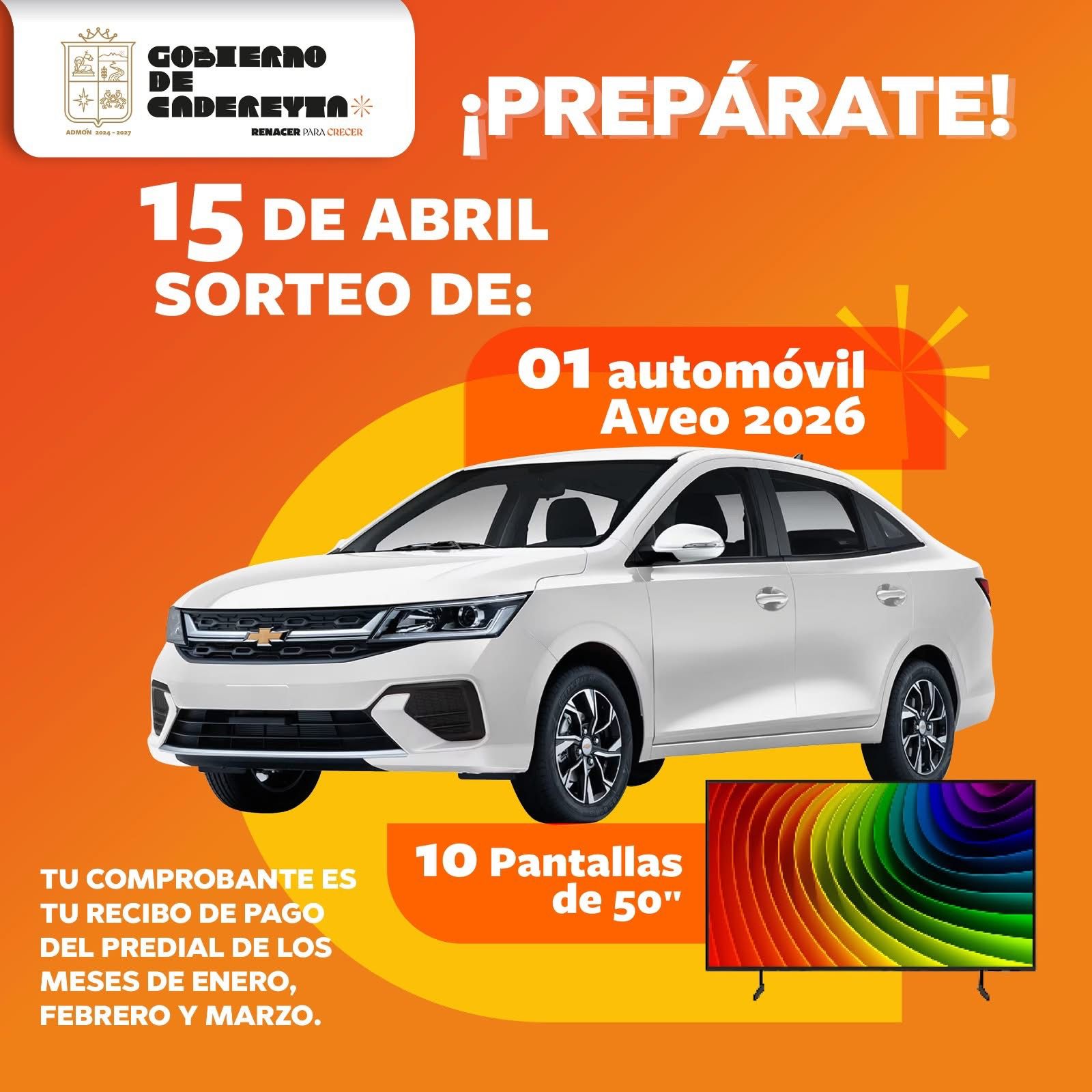 Cadereyta N.L.- ¡Atención! Se acerca el sorteo especial para todos los que cumplieron con su pago de impuesto predial en el mes de enero, febrero y marzo. Este 15 de abril se sortearán 10 pantallas de 50 pulgadas y un carro AVEO 2026. Asegúrate de tener a la mano tu comprobante de pago, es tu boleto para ganar.