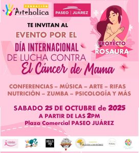 Juárez, N.L.- El sábado 25 de octubre, la Fundación Arteholica, prepara un evento en la explanada de la Zona Francesa del Paseo Juárez, en conmemoración del Día Internacional de la Lucha Contra el Cáncer de Mama.