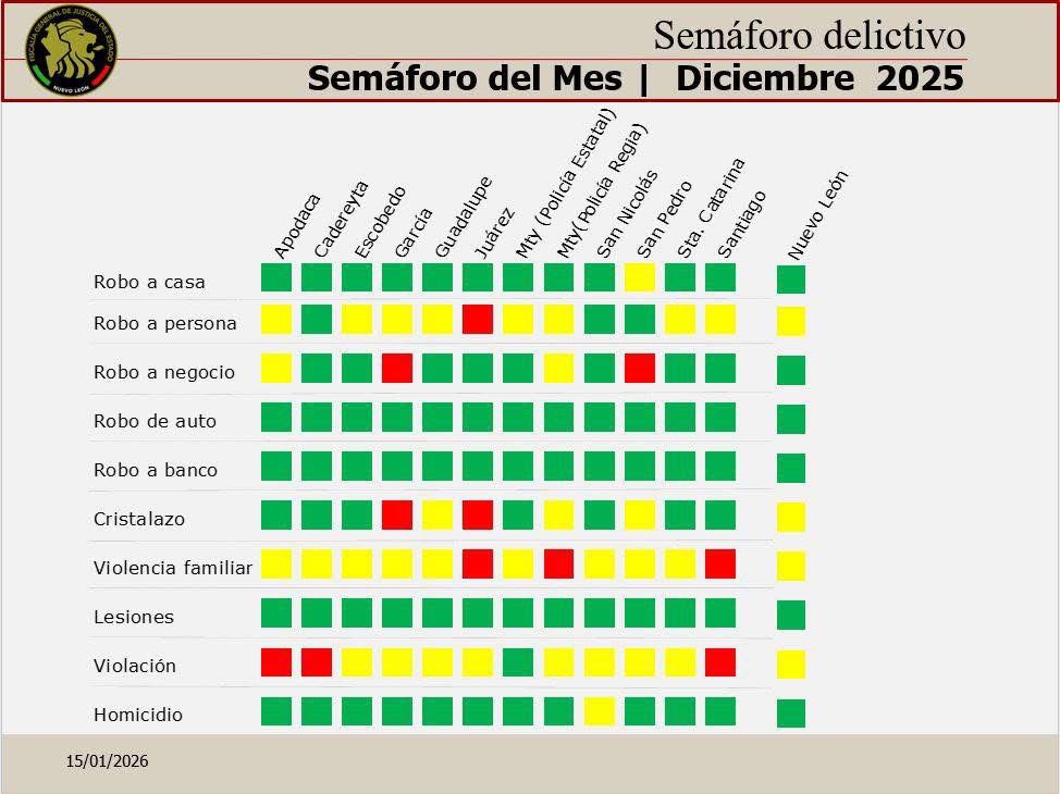 Durante diciembre de 2025, Cadereyta registró una reducción del 86% en delitos patrimoniales y cerró el mes con cero homicidios, lo que representa una disminución anual del 30%. Estos resultados se deben a la capacidad de reacción, coordinación operativa y estrategia de seguridad implementada en el municipio.