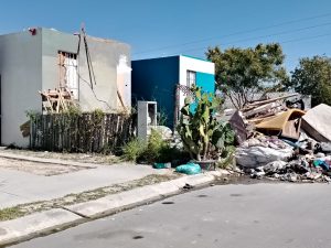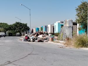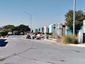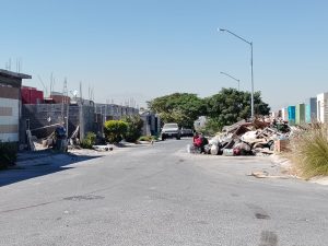 Juárez, N L.- Un domicilio de la colonia Nápoles, se encuentra totalmente tapado de basura, cuya acumulación llega hasta la mitad de la calle.