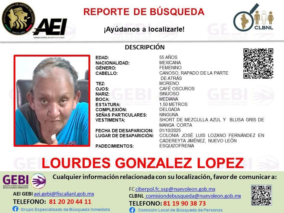 Cadereyta N.L.- Se solicita la colaboración de la ciudadanía para localizar a Lourdes González López, una mujer de 55 años que desapareció en la colonia José Luis Lozano en el municipio de Cadereyta.