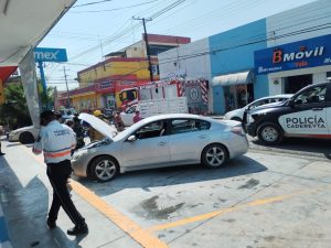 Cadereyta N.L.- Este lunes por la tarde, un vehículo se incendió en el centro de Cadereyta, específicamente en la calle 20 de Noviembre, antes de llegar al cruce con la calle Gonzalitos. Según testigos, la persona dueña del vehículo se encontraba comprando pinturas con su familia en un local cercano, cuando el vehículo comenzó a tirar humo y posteriormente ardió en llamas.