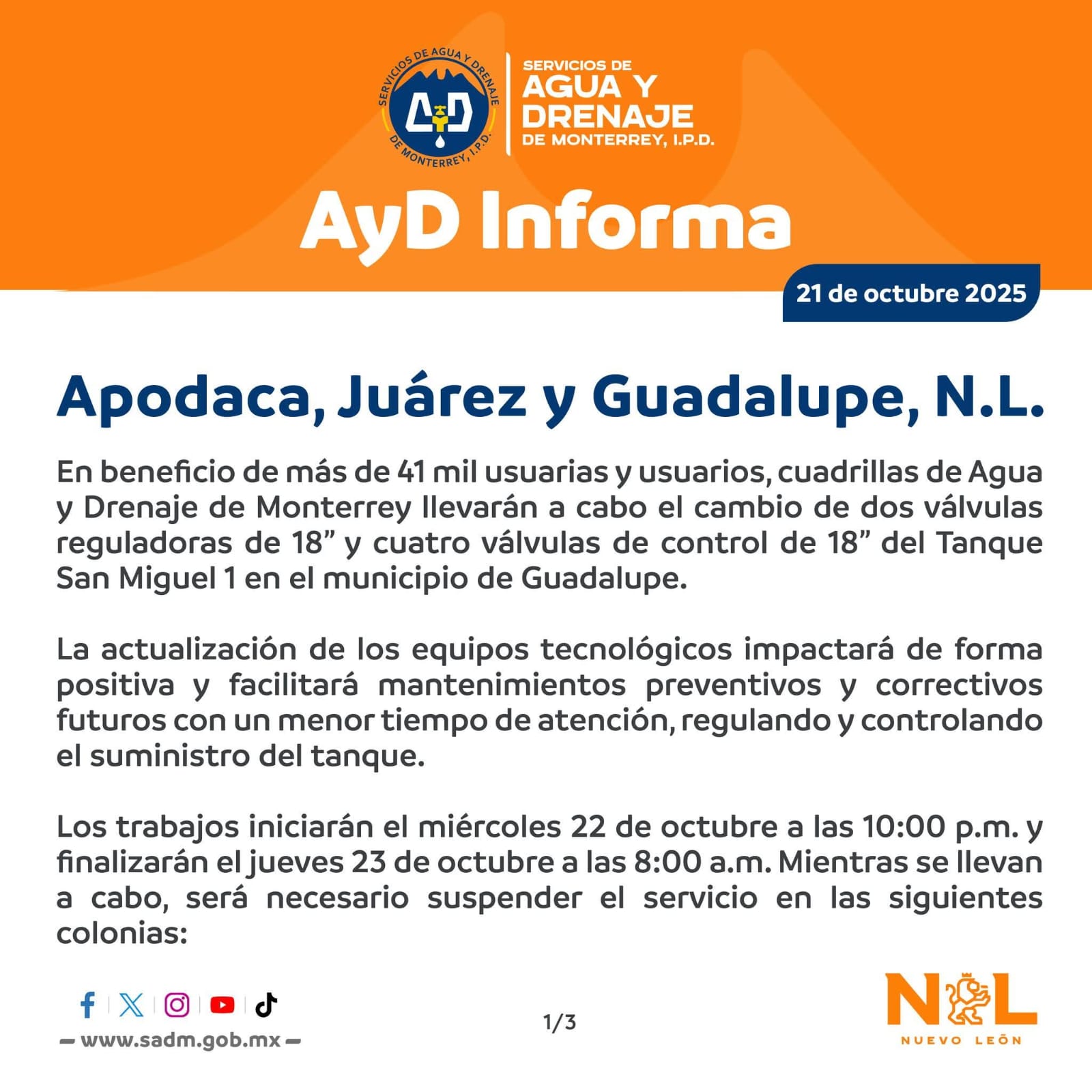 Juárez, N.L.- En alrededor de 10 horas, 11 colonias de Juárez, sufrirán corte de agua potable, debido a trabajos de modernización en el Tanque San Miguel 1, en el municipio de Guadalupe.
