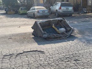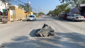 Vecinos compadecidos de las constantes caídas y desperfectos han puesto llantas y hasta un sofá que luce actualmente, para avisar del peligro.