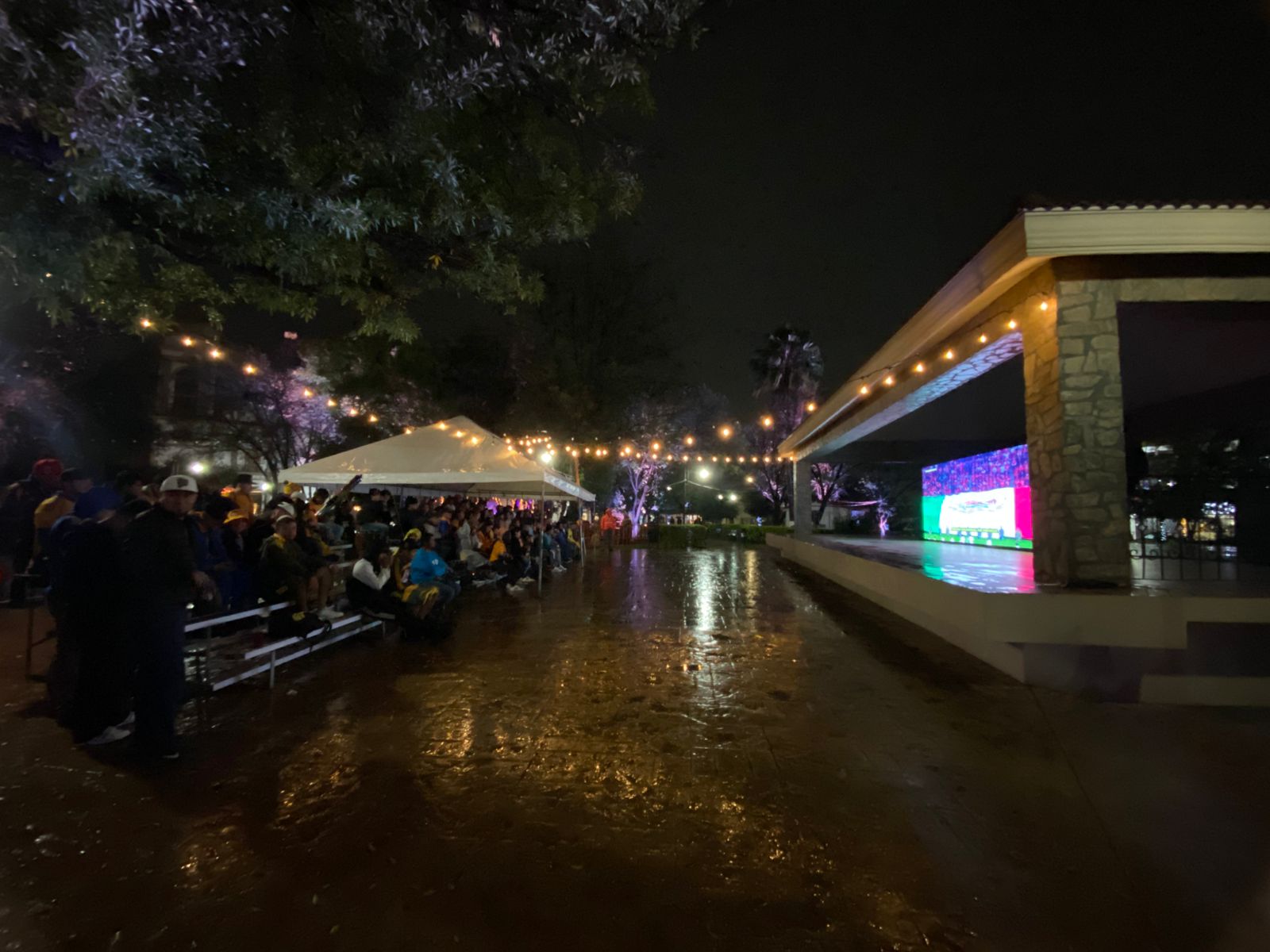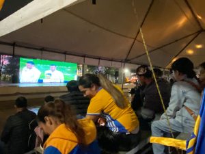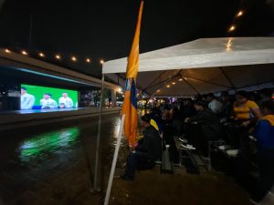 A pesar del clima lluvioso, muchos seguidores de ambos equipos se dieron cita en la plaza, donde se instaló una carpa para proteger a los asistentes. La emoción fue palpable mientras se proyectaba el partido en una pantalla gigante.