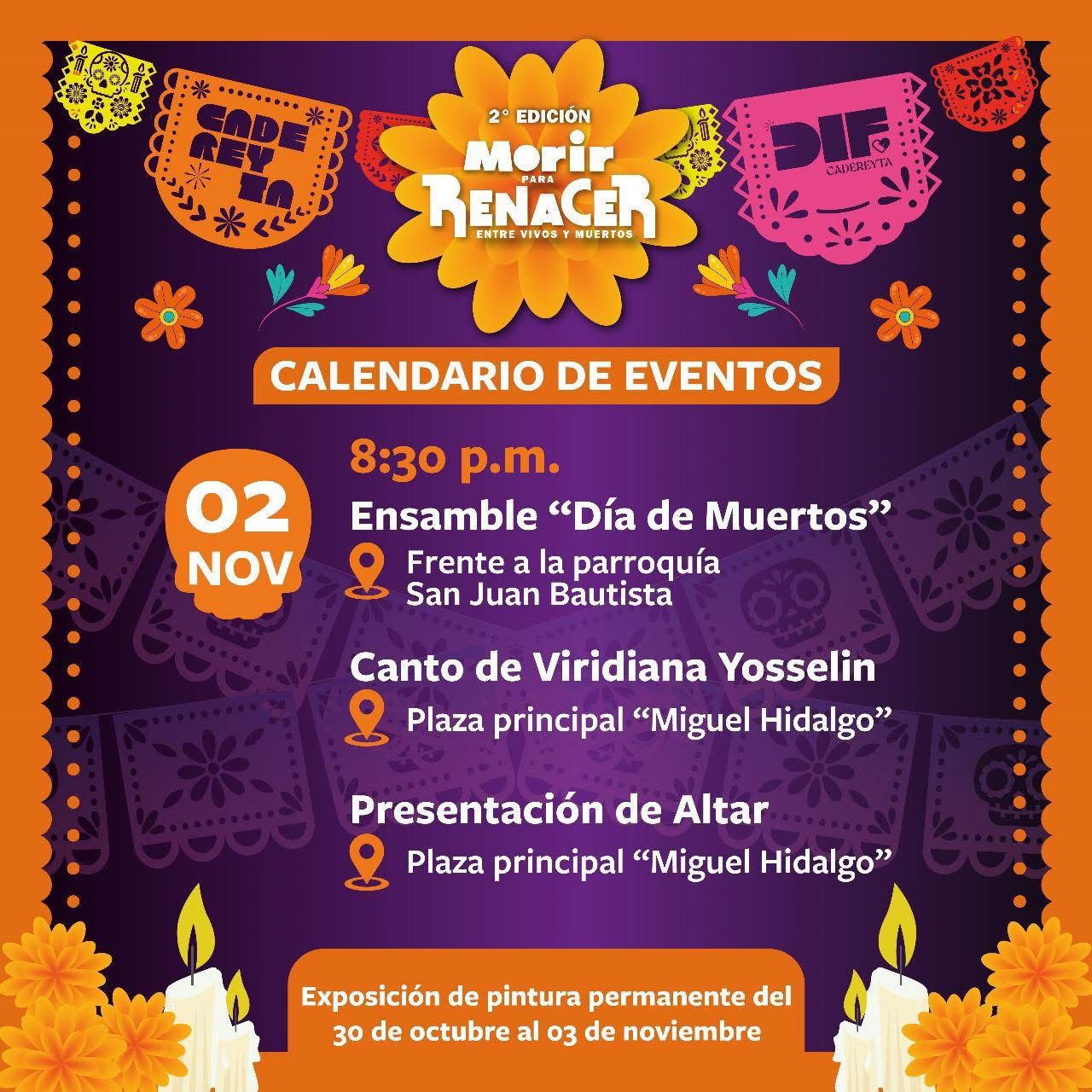 Cadereyta N.L.- El Gobierno de Cadereyta Jiménez te invita a disfrutar de las festividades en honor a la vida y la memoria de quienes ya no están. La celebración iniciará frente a la Parroquia San Juan Bautista con el Ensamble de Días Muertos, para continuar con el canto de Viridiana Joseline y posteriormente la presentación del altar de muertos en la Plaza Principal.