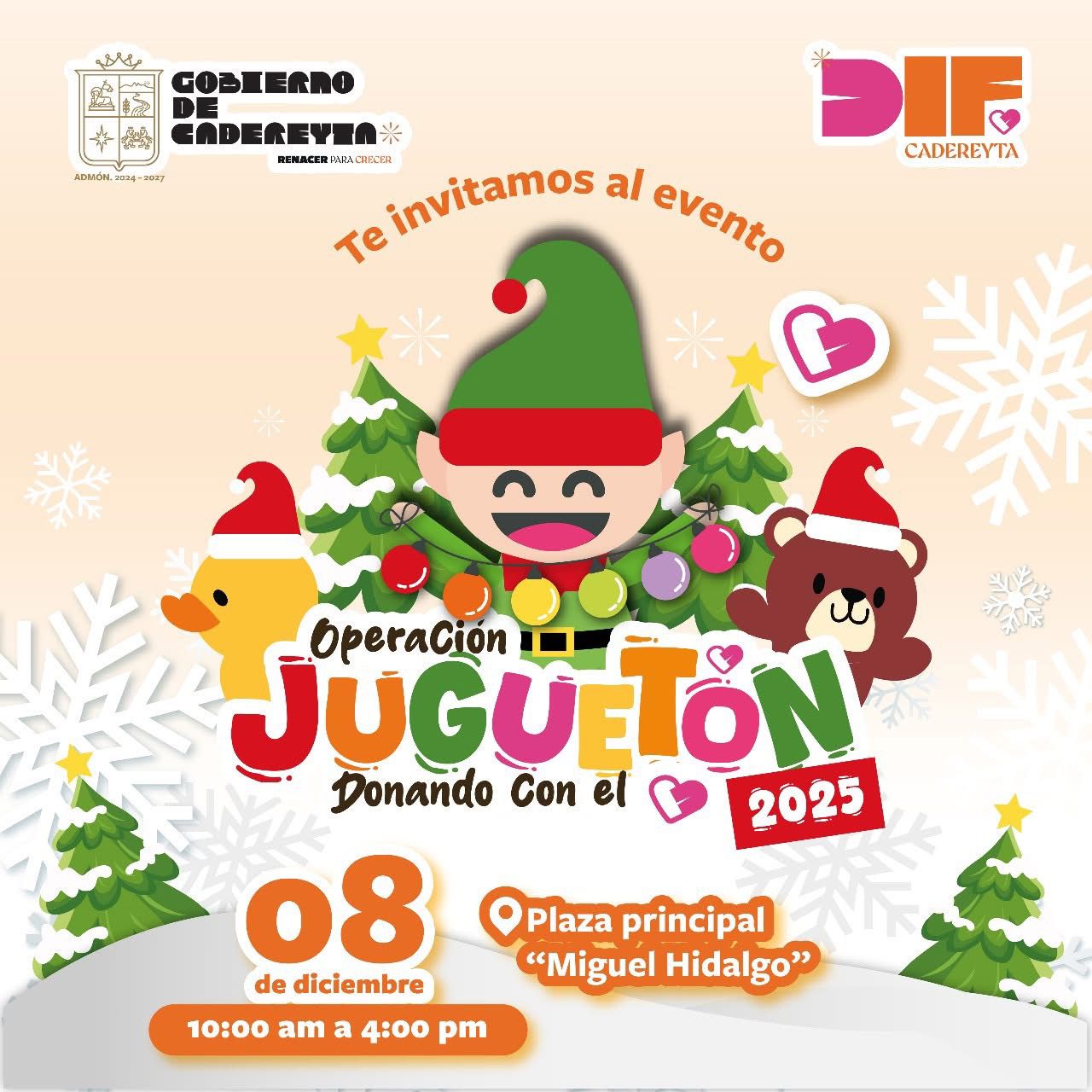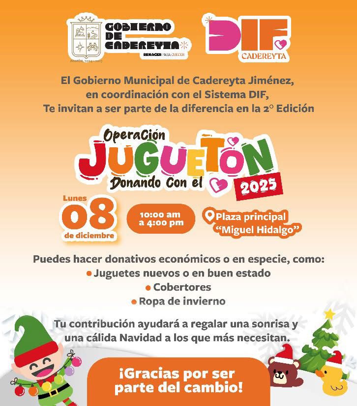 Cadereyta N.L.- El Gobierno Municipal de Cadereyta Jiménez, encabezado por el alcalde Carlos Rodríguez “El Cuate”, invita a la comunidad a sumarse a la 2.ª edición de Operación Juguetón 2025, un evento solidario que busca regalar una sonrisa a quienes más lo necesitan.+